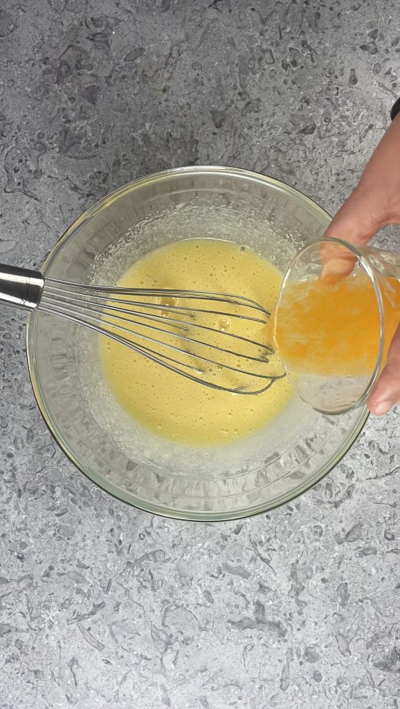 Ajoute le zeste à la pâte et verse le jus en filet tout en mélangeant.