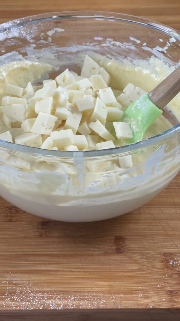 Termine l’élaboration de la pâte avec l’Asiago coupé en dés.