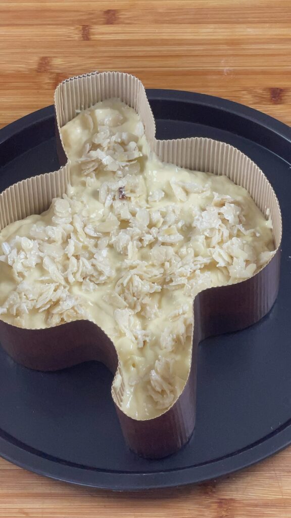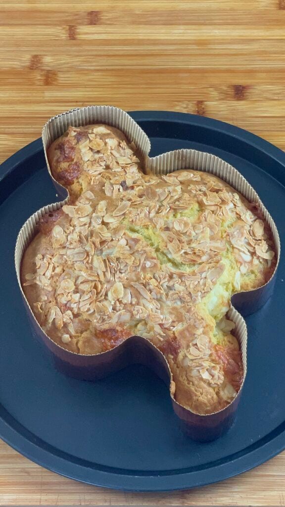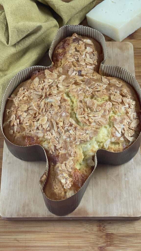 La recette de cette colombe est simple et intuitive, une base de gâteau au yaourt enrichie de fromage Asiago et complétée par la classique couverture d’amandes effilées.