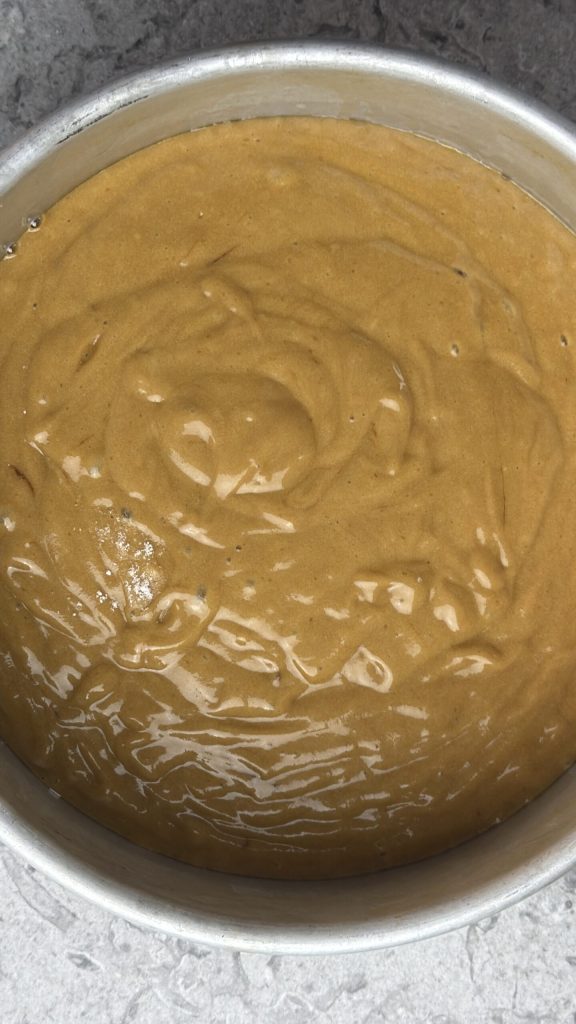 Verse la pâte dans un moule de 20 cm de diamètre (préférablement 22 cm si tu veux un gâteau un peu plus bas), beurré ou recouvert de papier cuisson.