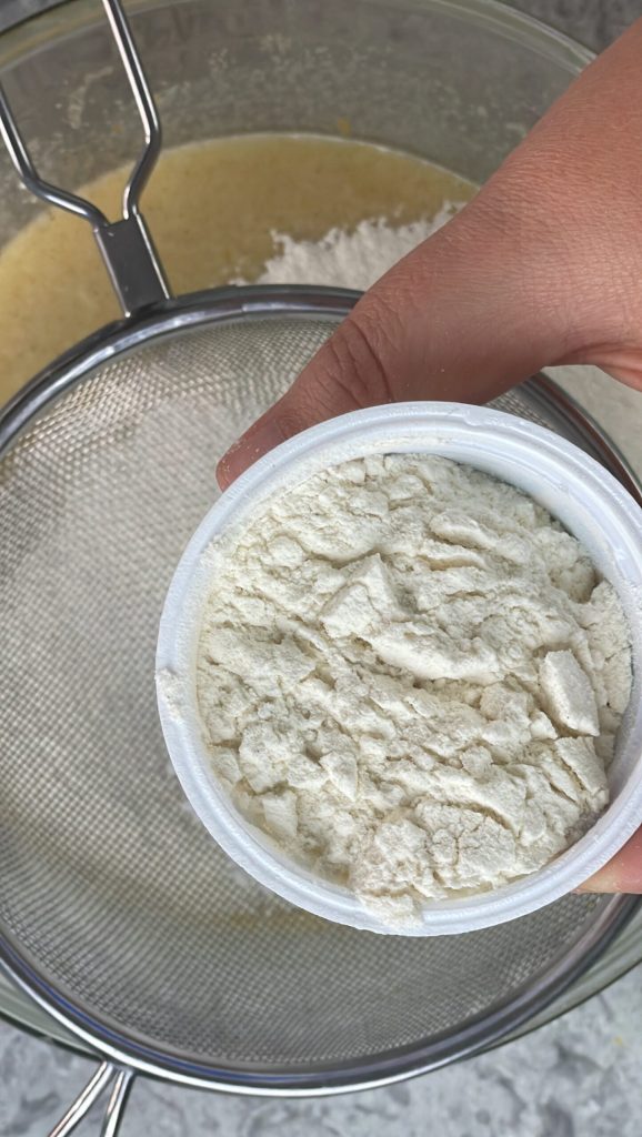 C’est maintenant le tour des ingrédients secs. Tamisez directement dans le bol un sachet de levure chimique et 3 pots de farine 00.