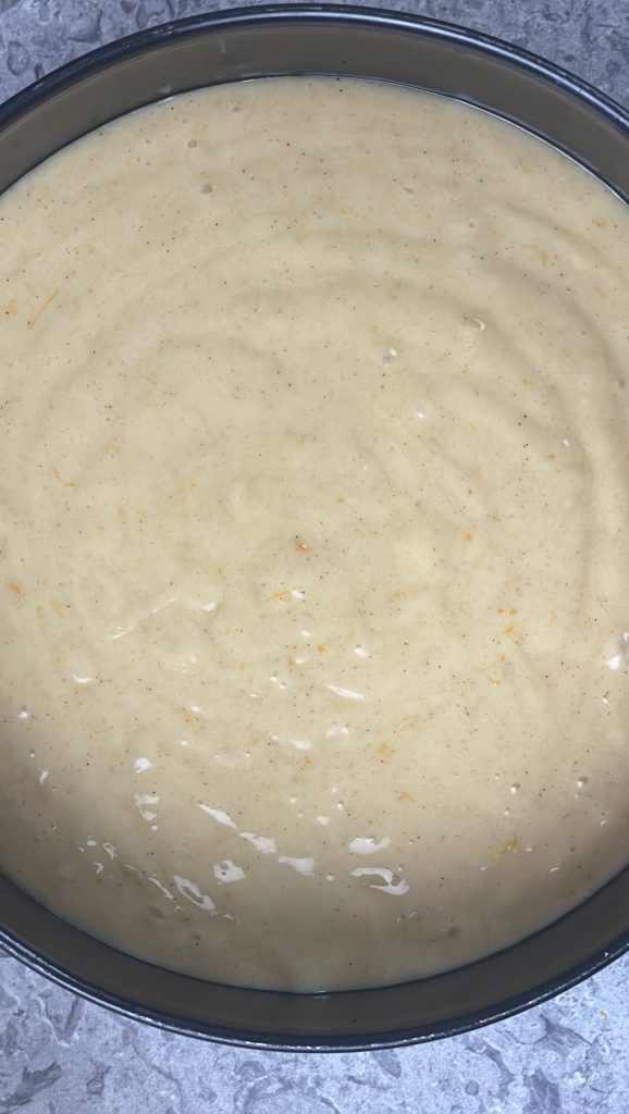 Transférez la pâte du gâteau dans un moule de 22-23 cm beurré ou recouvert de papier sulfurisé.