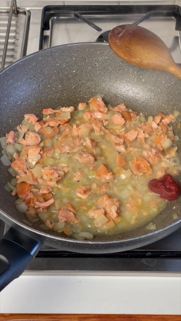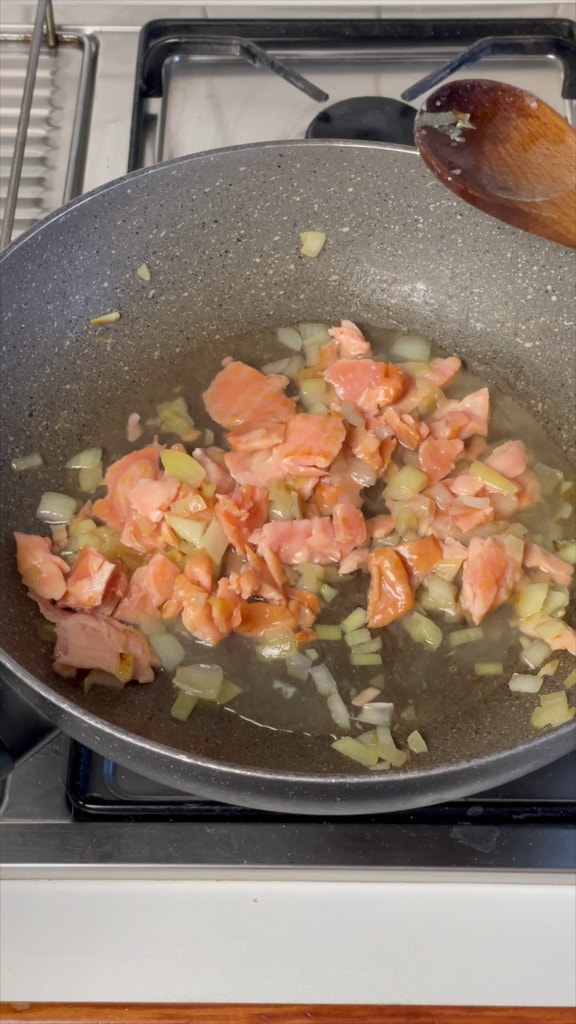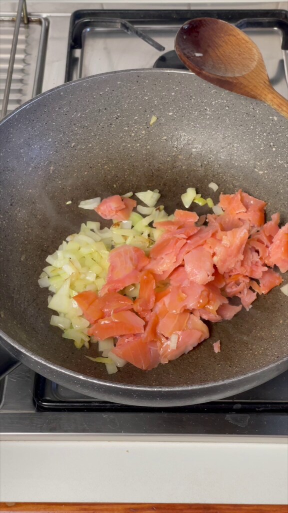 Hachez le saumon fumé avec un couteau et mettez-le dans la poêle avec l’oignon.