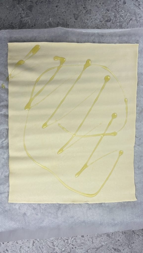 • À l’aide d’une roulette à pâte, découpez des bandelettes d’environ 1 cm – 1,5 cm en coupant le long du côté court de la pâte.