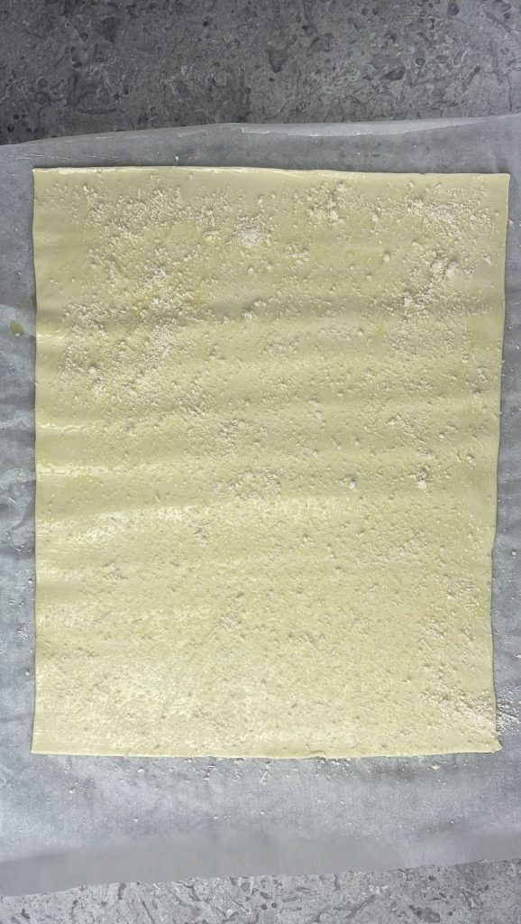 • Commencez la préparation des gressins feuilletés au parmesan en étalant le rouleau de pâte feuilletée sur un plan.