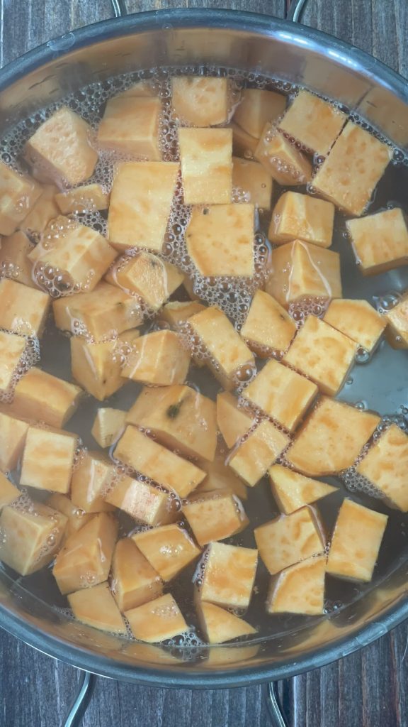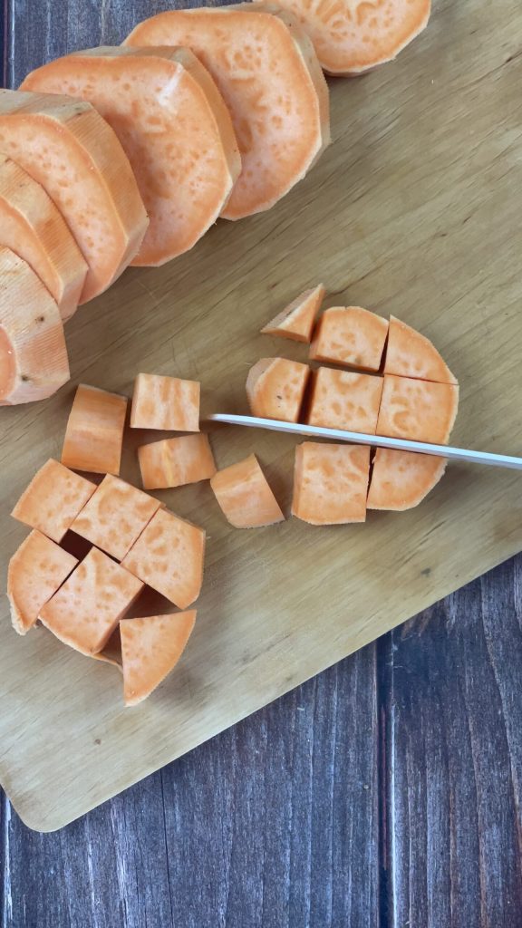Commence la préparation de l’houmous de patates douces en lavant, épluchant et coupant la patate douce en dés.