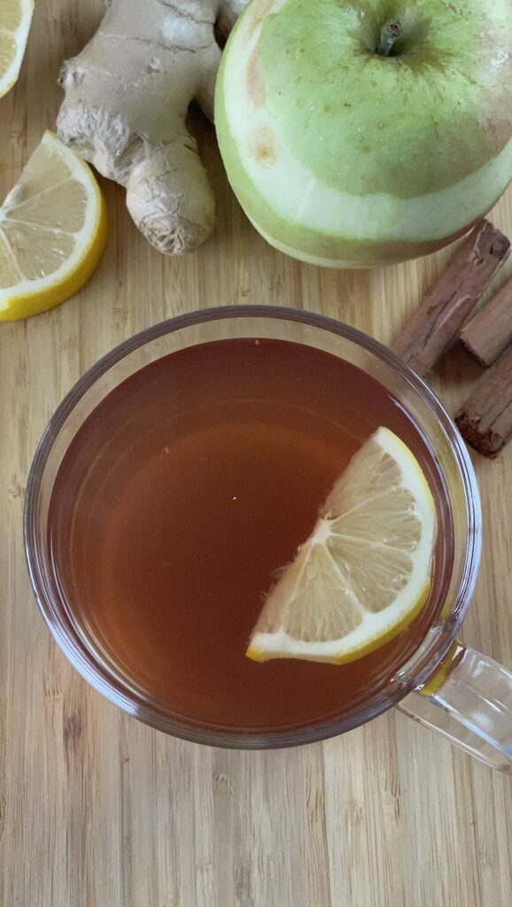 Cette recette est simple à préparer et utilise des ingrédients naturels et aromatiques comme la peau de pomme, le zeste de citron, le gingembre frais et les bâtons de cannelle, créant un mélange enveloppant qui vous réchauffera dans les journées les plus froides.