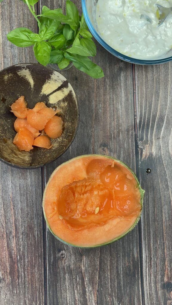 Coupez le melon cantaloup en deux et avec une cuillère retirez les graines.