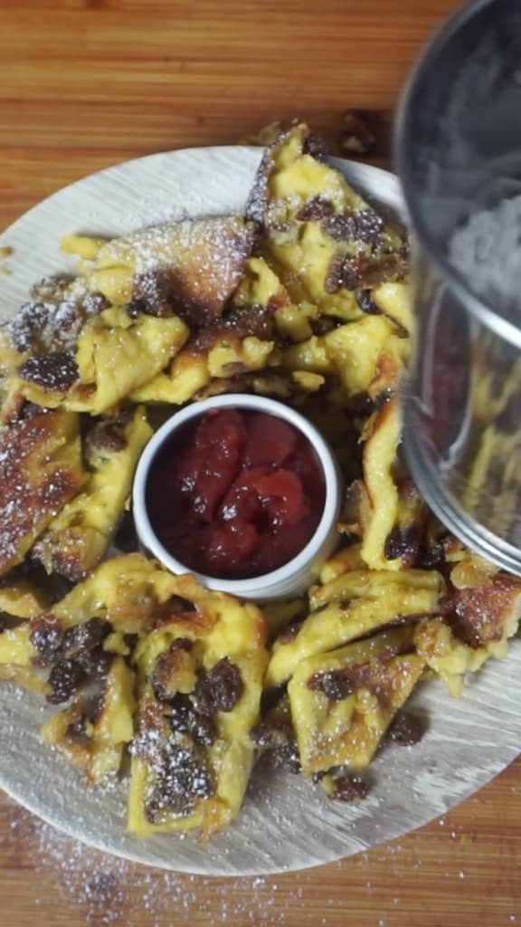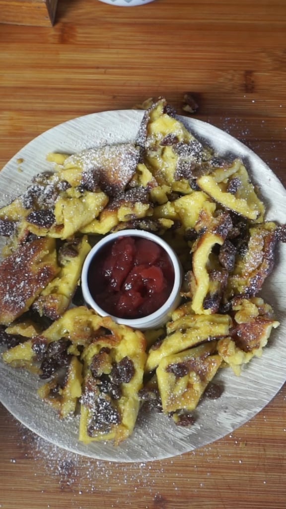 Le Kaiserschmarrn – ou Kaiserschmarren – est une sorte d’omelette sucrée enrichie de raisins secs et de rhum et c’est une recette typique de la cuisine autrichienne et du Trentin-Haut-Adige. Cette « omelette de l’empereur » est servie en morceaux, saupoudrée de sucre glace et accompagnée d’une confiture de canneberges. Cette recette s’inspire davantage de la version tyrolienne : dans la version autrichienne, en effet, les blancs d’œufs sont montés en neige.