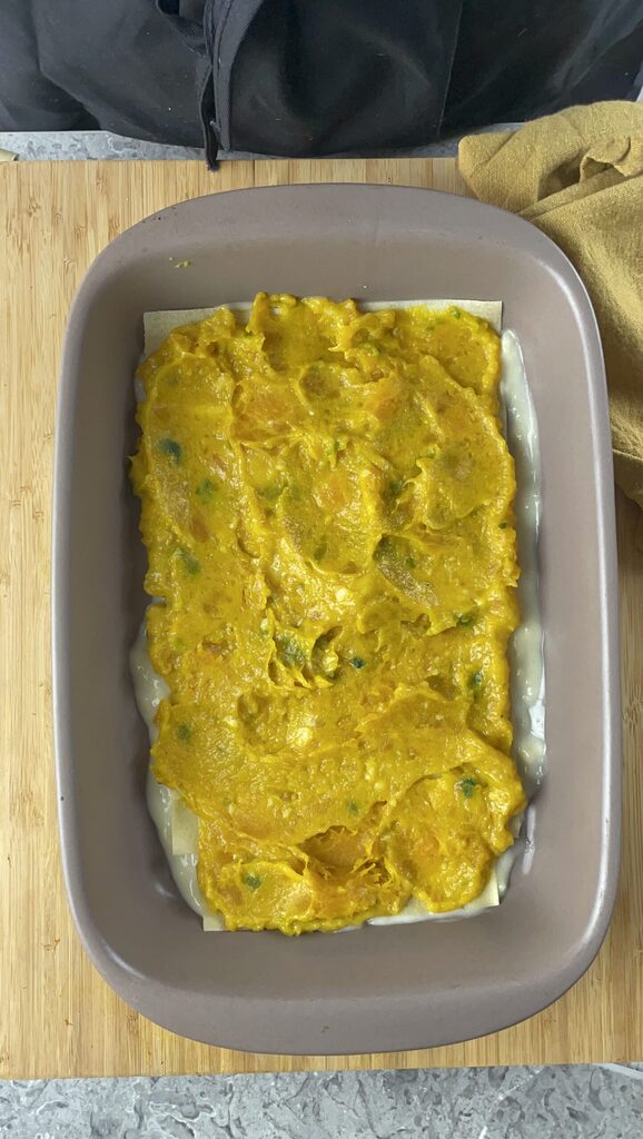 Compose la dernière couche avec la béchamel restante et un peu de crème de courge.