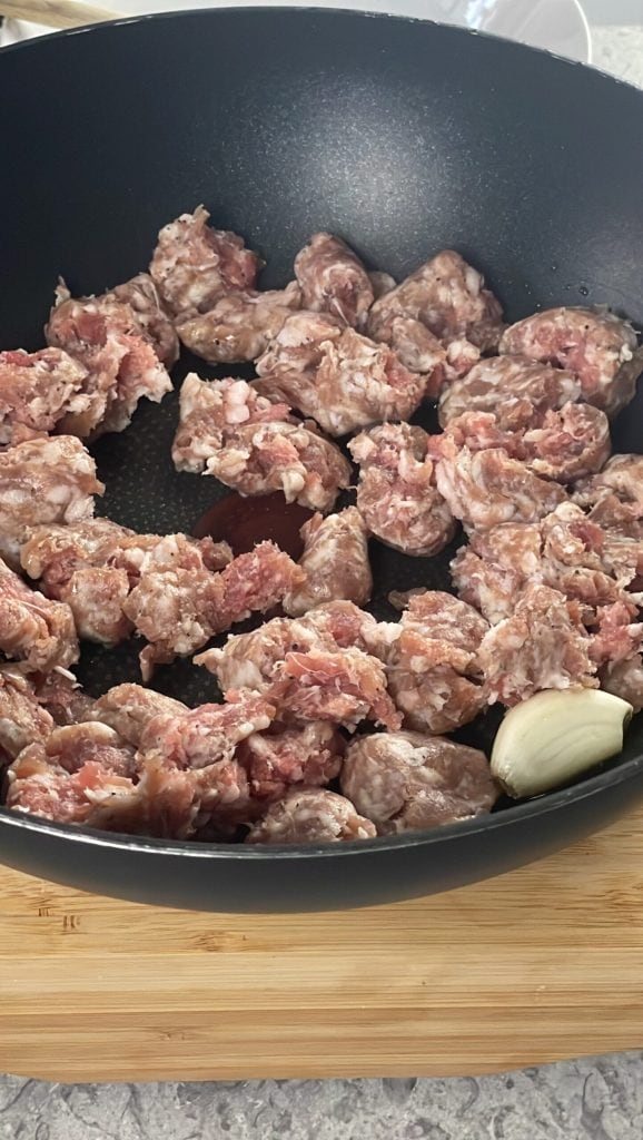 Émiettez la saucisse en retirant le boyau.Chauffez l’huile d’olive extra vierge dans une poêle, ajoutez une gousse d’ail et laissez-la dorer.