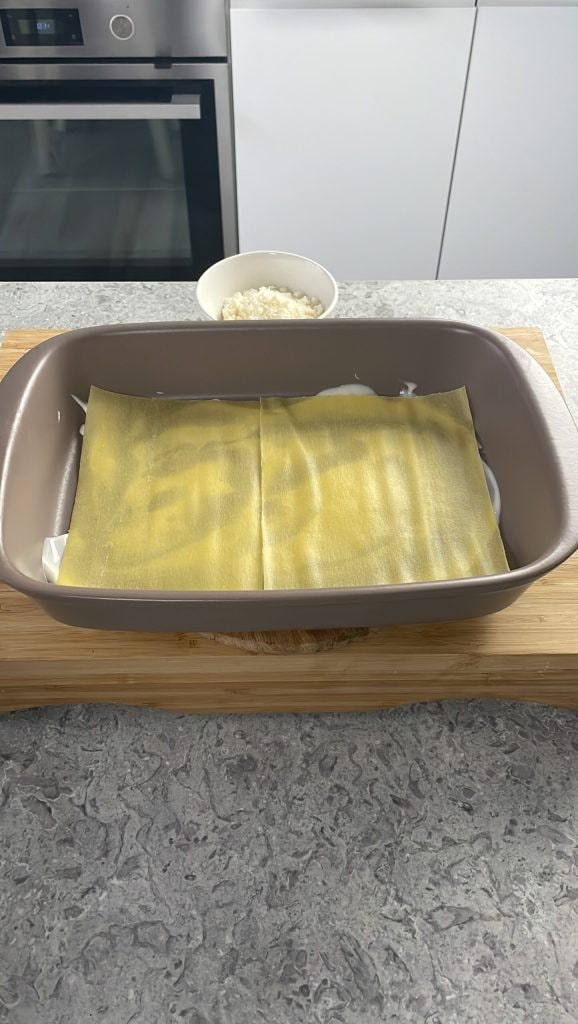 Répétez l’opération pour deux ou trois autres couches.Pour finir, couvrez les lasagnes avec 4-5 cuillères de béchamel et une généreuse couche de parmesan râpé.