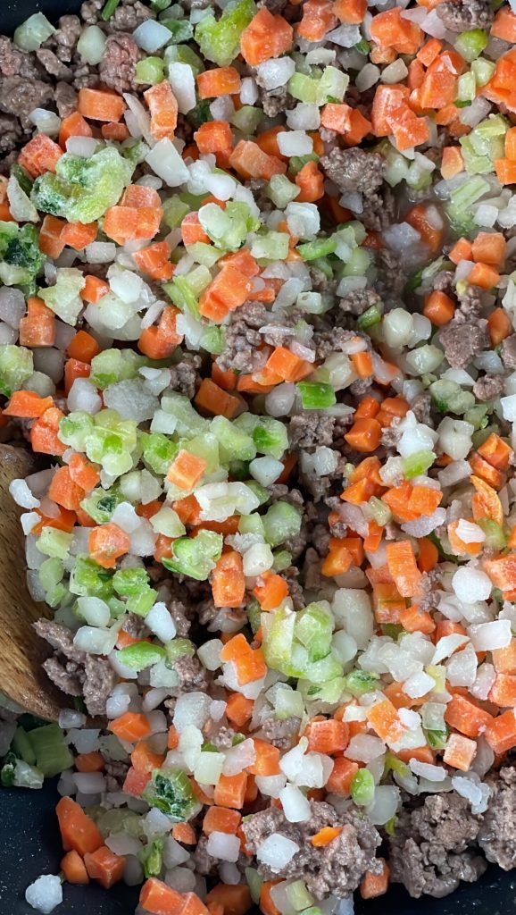 Ajoutez la viande hachée de bœuf et faites-la bien dorer.Quand la viande est bien dorée, déglacez avec du vin blanc et laissez-le évaporer à feu vif.