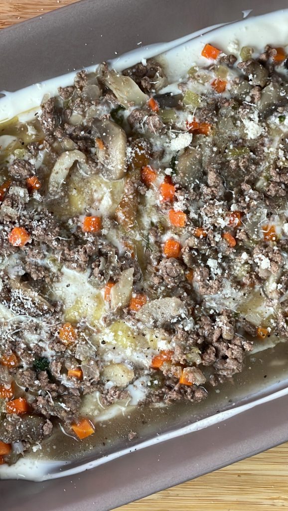 Ajoutez ensuite 2-3 louches de ragù blanc avec les champignons.Complétez la première couche avec le poivre noir et le Parmigiano Reggiano râpé.