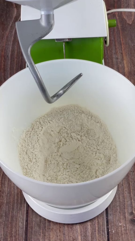 Mets ces deux ingrédients dans le bol du robot de cuisine.Commence à pétrir à vitesse moyenne et continue jusqu’à ce que la pâte se soit accrochée au crochet.