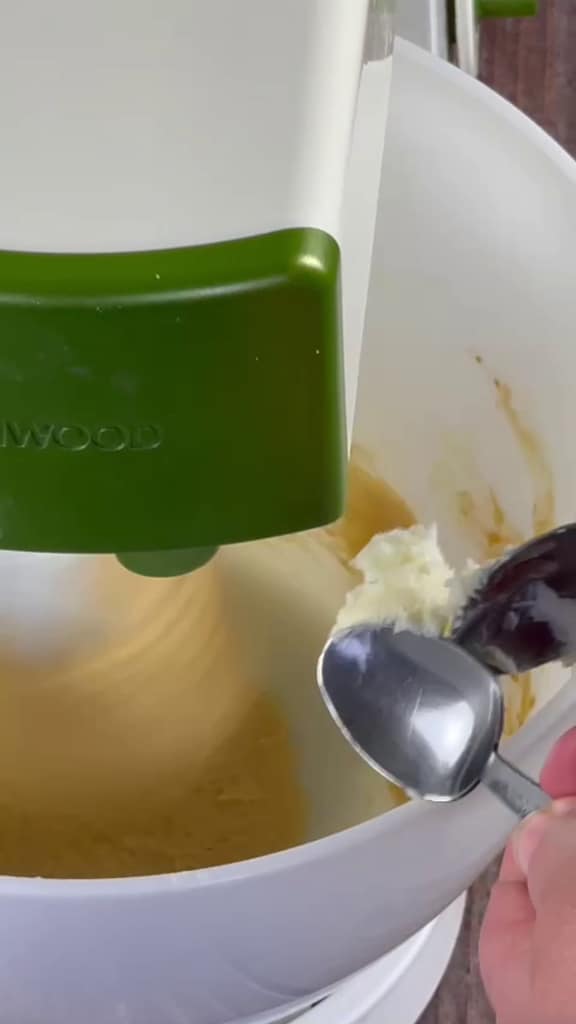 Ajoute le beurre mou à température ambiante, une cuillère à la fois, en attendant qu’il soit complètement amalgamé avant d’en ajouter un autre.