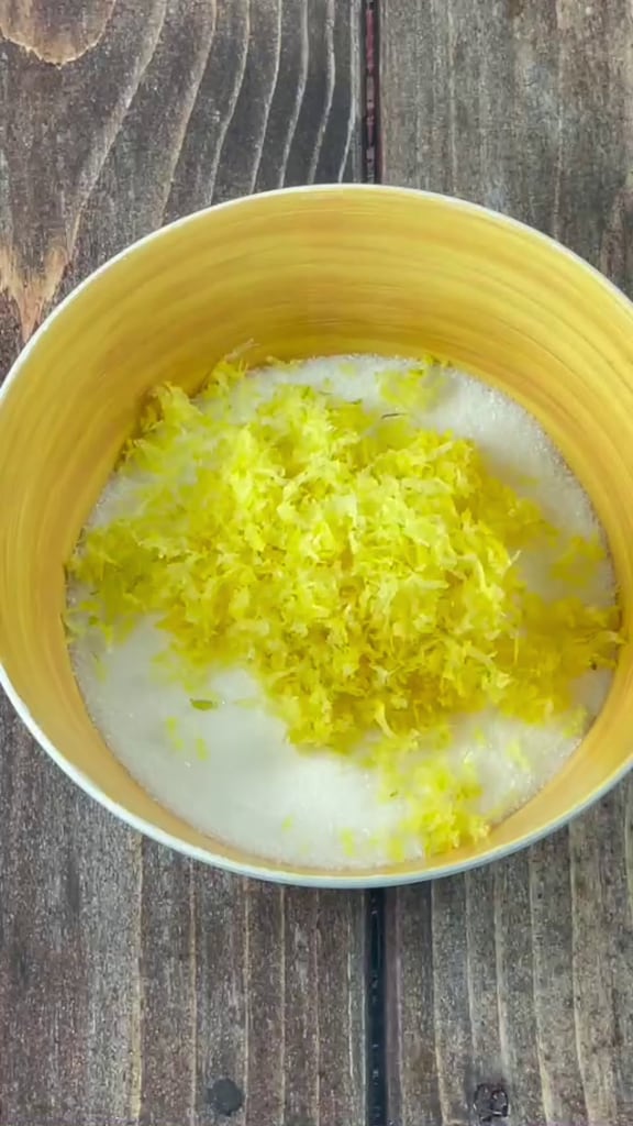 Pèse dans un saladier le sucre en poudre et ajoute le zeste de 2-3 citrons non traités.