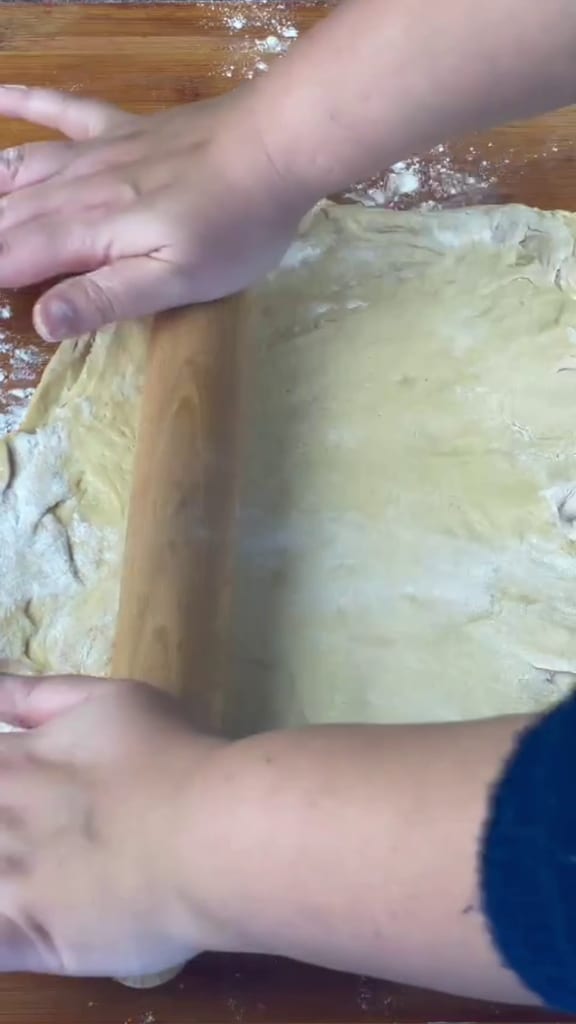 Étale la pâte levée sur un plan de travail fariné à l’aide d’un rouleau à pâtisserie pour former un rectangle.