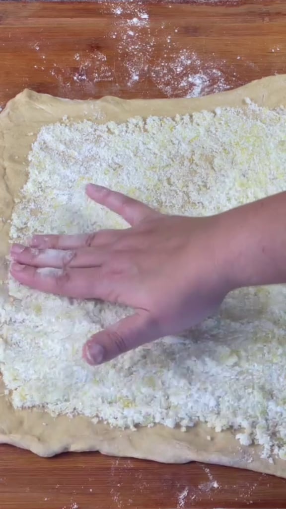Mélange bien et laisse macérer pendant au moins 30 minutes.Étale la pâte levée sur un plan de travail fariné à l’aide d’un rouleau à pâtisserie pour former un rectangle.