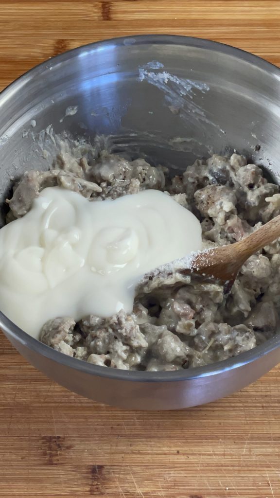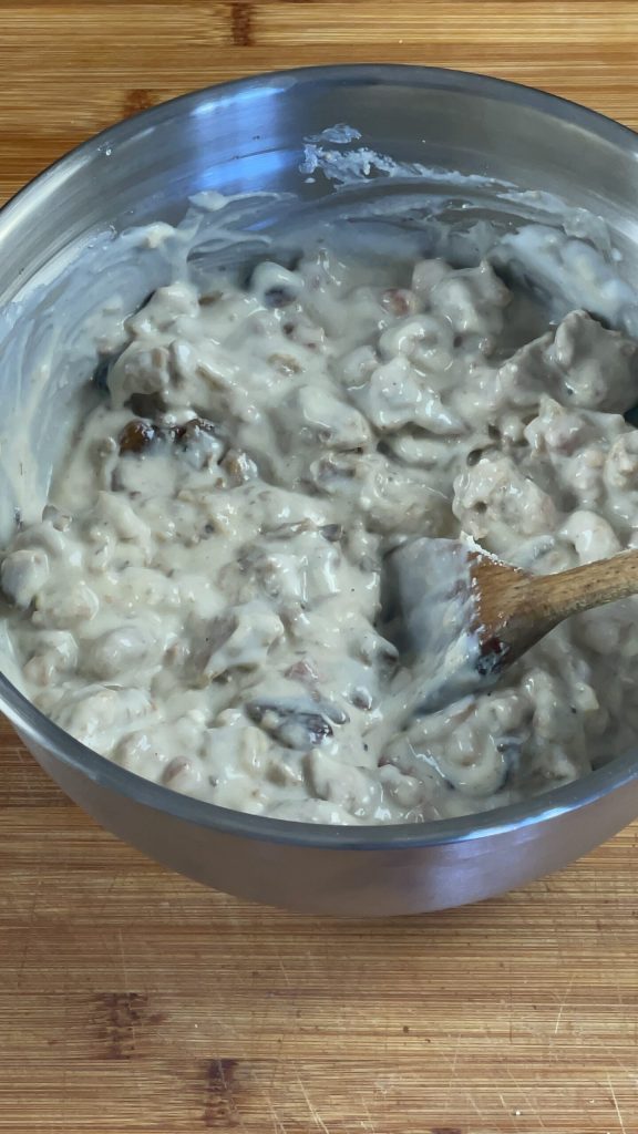 Mets dans le saladier de la farce des lumaconi aussi la moitié de la béchamel préparée.Mélange avec une cuillère ou une spatule jusqu’à obtenir un mélange homogène.