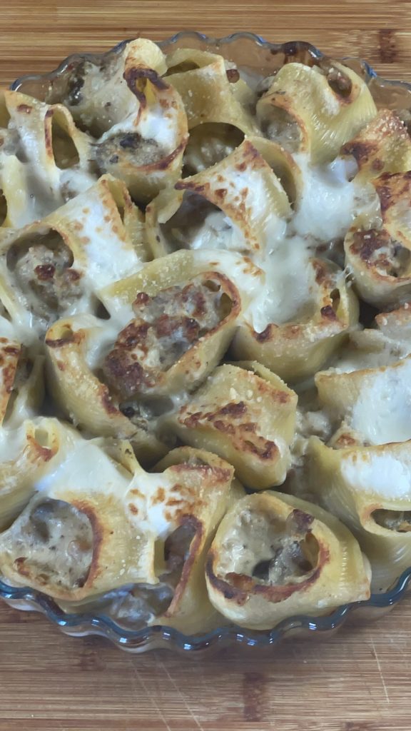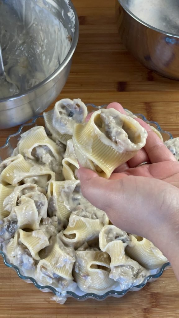 Lumaconi farcis aux champignons et saucisse, un plat principal riche et savoureux parfait à servir pendant les déjeuners dominicaux ou les occasions spéciales et les fêtes.