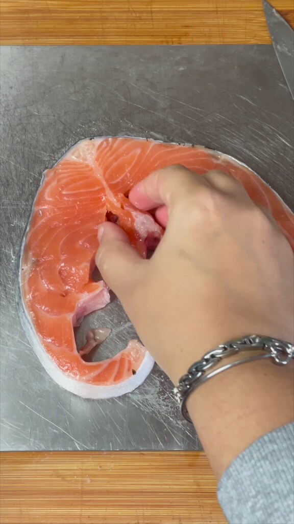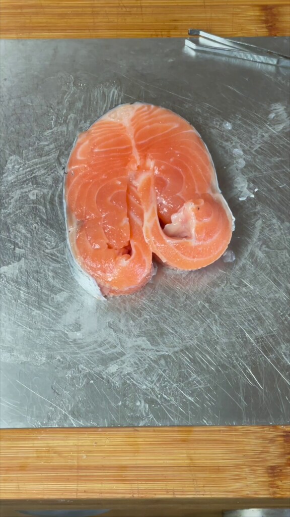 Formez maintenant les médaillons de saumon : retirez l' »os » central avec un couteau et éventuelles arêtes avec une pince spéciale. Retirez également la peau des extrémités inférieures.