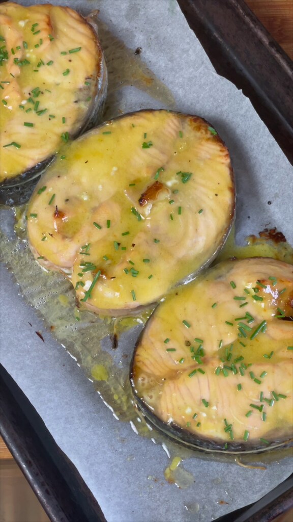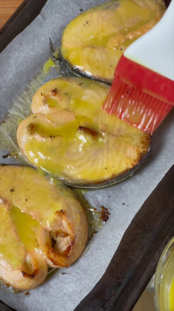 Transférez les médaillons de saumon sur une plaque recouverte de papier sulfurisé et badigeonnez-les de sauce à la moutarde, miel et citron.