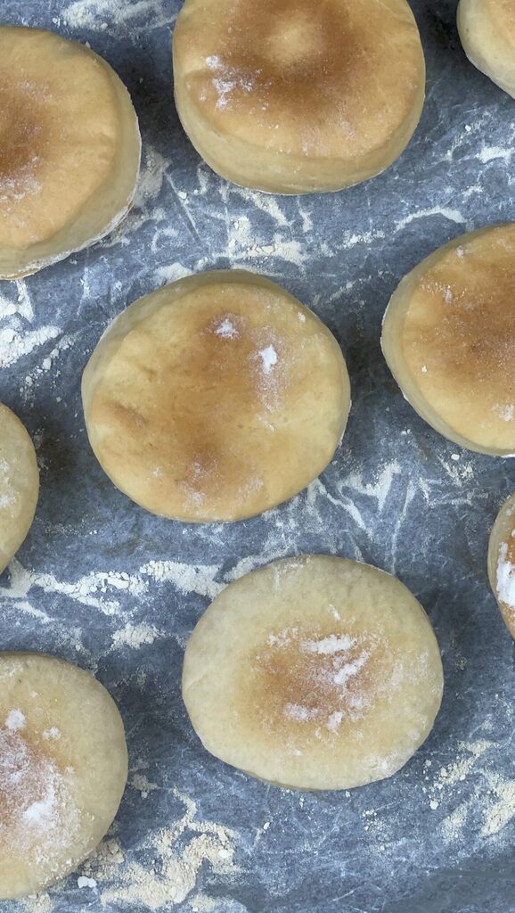 Muffins anglais cuits au four, petits pains levés de la tradition anglo-saxonne parfaits à garnir aussi bien avec des ingrédients sucrés que salés.