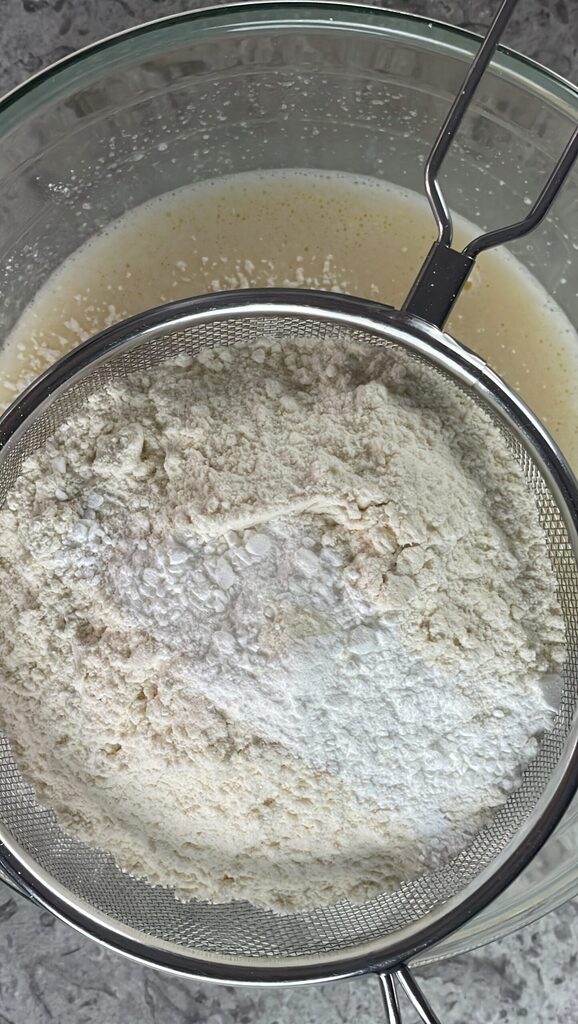 Tamise la farine T45 et la levure chimique directement dans le bol avec les ingrédients liquides.