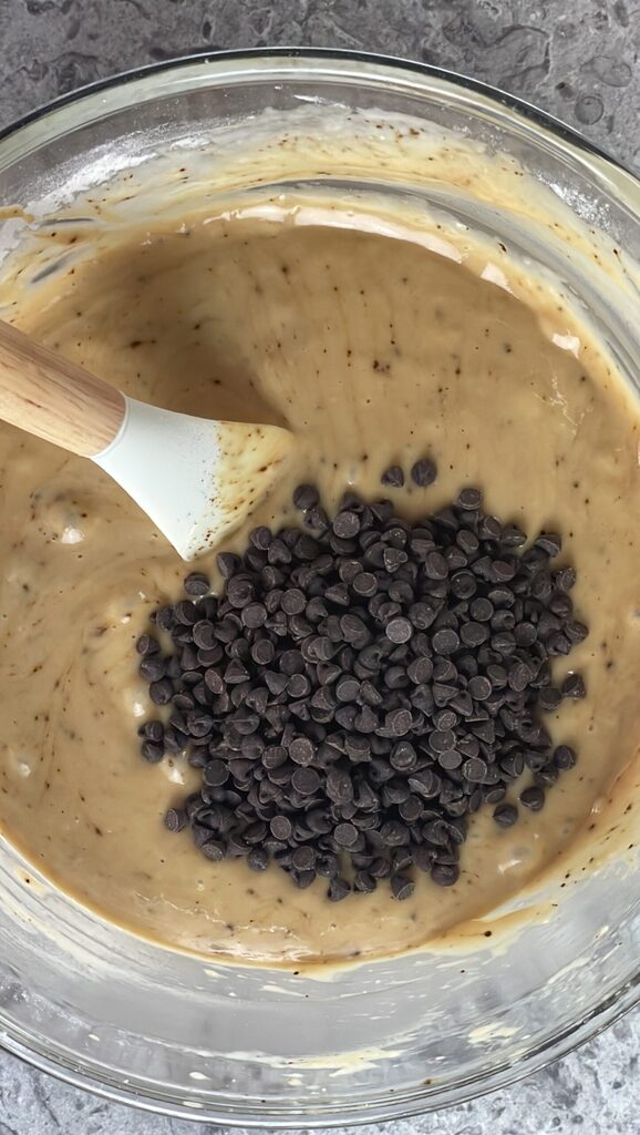 Il ne te reste plus qu’à ajouter les pépites de chocolat et à mélanger à nouveau pour les répartir uniformément.