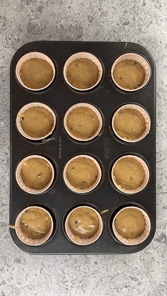 Transfère la pâte dans les caissettes à muffins en les remplissant aux deux tiers avec une cuillère ou avec une cuillère à glace.