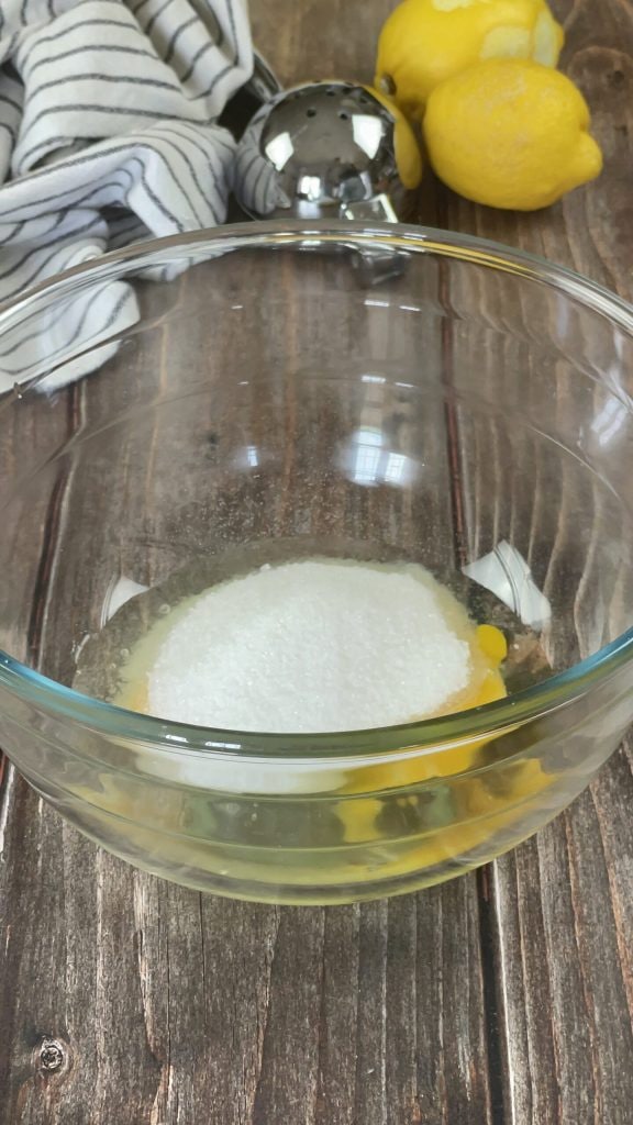 Commence la préparation des muffins au citron et graines de pavot en mélangeant les œufs et le sucre avec un fouet – manuel ou électrique.
