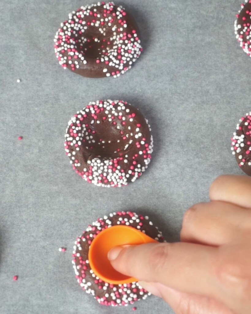 Écrase chaque boule de pâte avec les doigts ou avec le dos d’une cuillère à café pour former un creux.