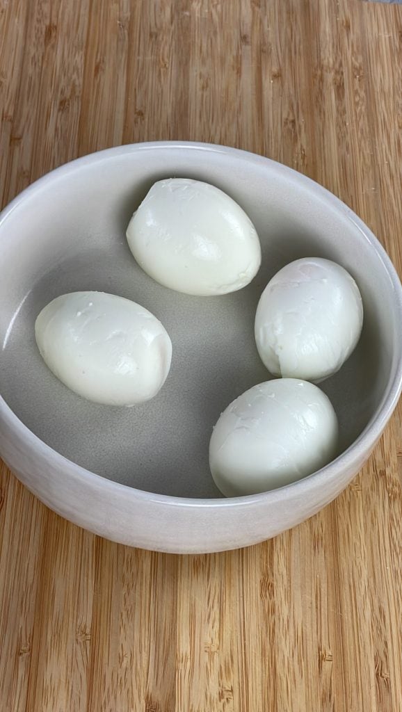 – directement dans la casserole avec l’eau froide pendant 15 minutes.Une fois durs, égoutte les œufs et plonge-les dans l’eau froide pour arrêter la cuisson.