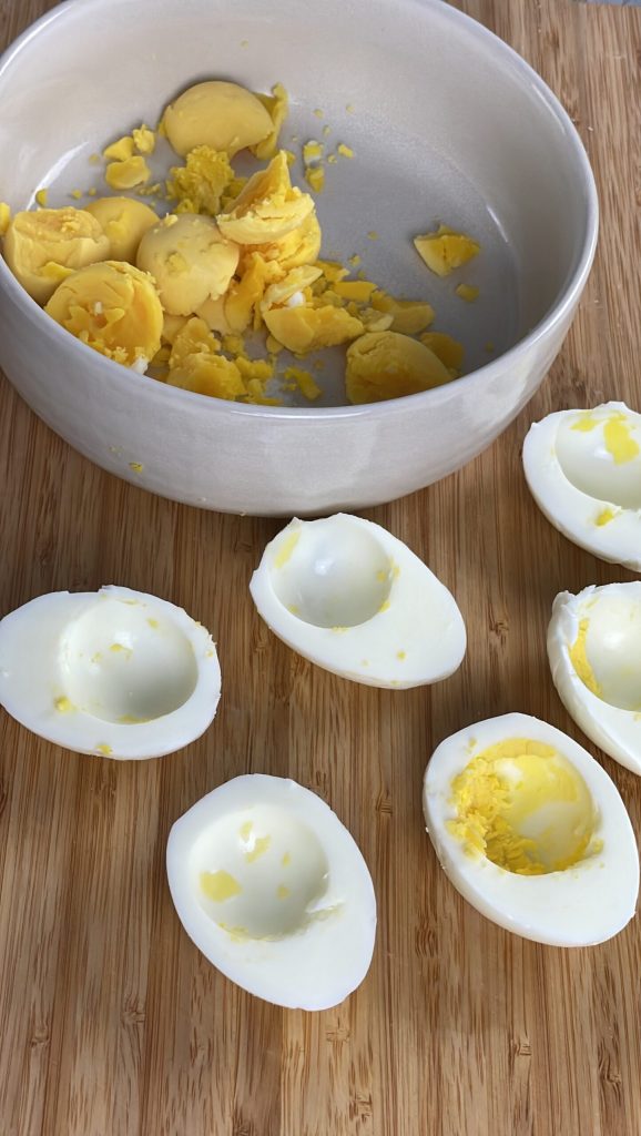 Écale-les délicatement en essayant de ne pas les abîmer.Coupe les œufs en deux dans le sens de la longueur.