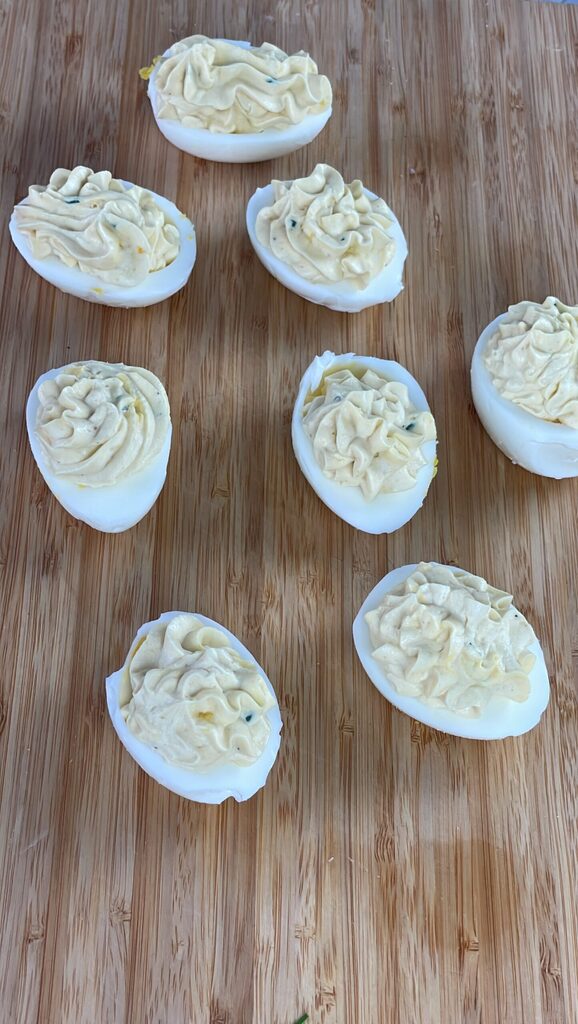 La ricotta rend la farce crémeuse et enveloppante, tandis que la ciboulette et une pincée de poivre noir ajoutent une touche de fraîcheur et de parfum. Pour un goût plus prononcé, tu peux les enrichir avec une cuillère à café de curry : une variante originale qui surprendra agréablement tes invités. Servis froids, ces œufs farcis sont parfaits aussi pour un pique-nique ou un brunch du dimanche.