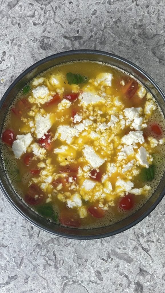 Les œufs, les tomates cerises et la feta créent un mélange parfait entre douceur et salinité, tandis que le basilic frais (ou les herbes aromatiques de votre choix) ajoute une touche parfumée et méditerranéenne. C’est le plat « sauve-dîner » classique à toujours garder en tête : il vous suffit d’un bol et d’un plat à four, pas de friture et très peu de graisses.