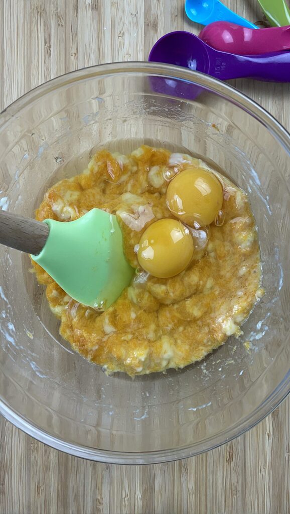 Ajoutez également les œufs dans le saladier et mélangez bien.