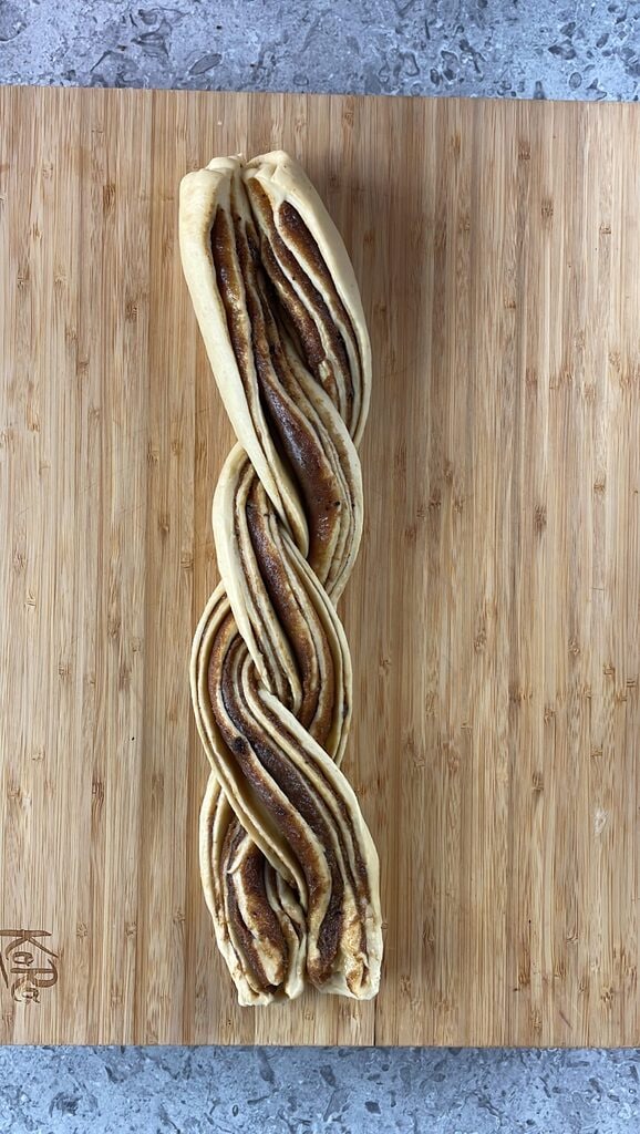 Le Kringel a des origines nordiques et est traditionnellement préparé pendant les fêtes en Estonie et dans les pays baltes. Sa particularité réside dans le travail de la pâte : après avoir été étalée et garnie, elle est roulée, coupée et tressée, créant une forme unique et spectaculaire. Mon pain à la cannelle suit le même procédé, avec une pâte moelleuse réalisée avec de la farine Manitoba, du lait, du beurre et une pincée de vanille, tandis que la garniture déborde de beurre et de cannelle, pour un goût intense et enveloppant.