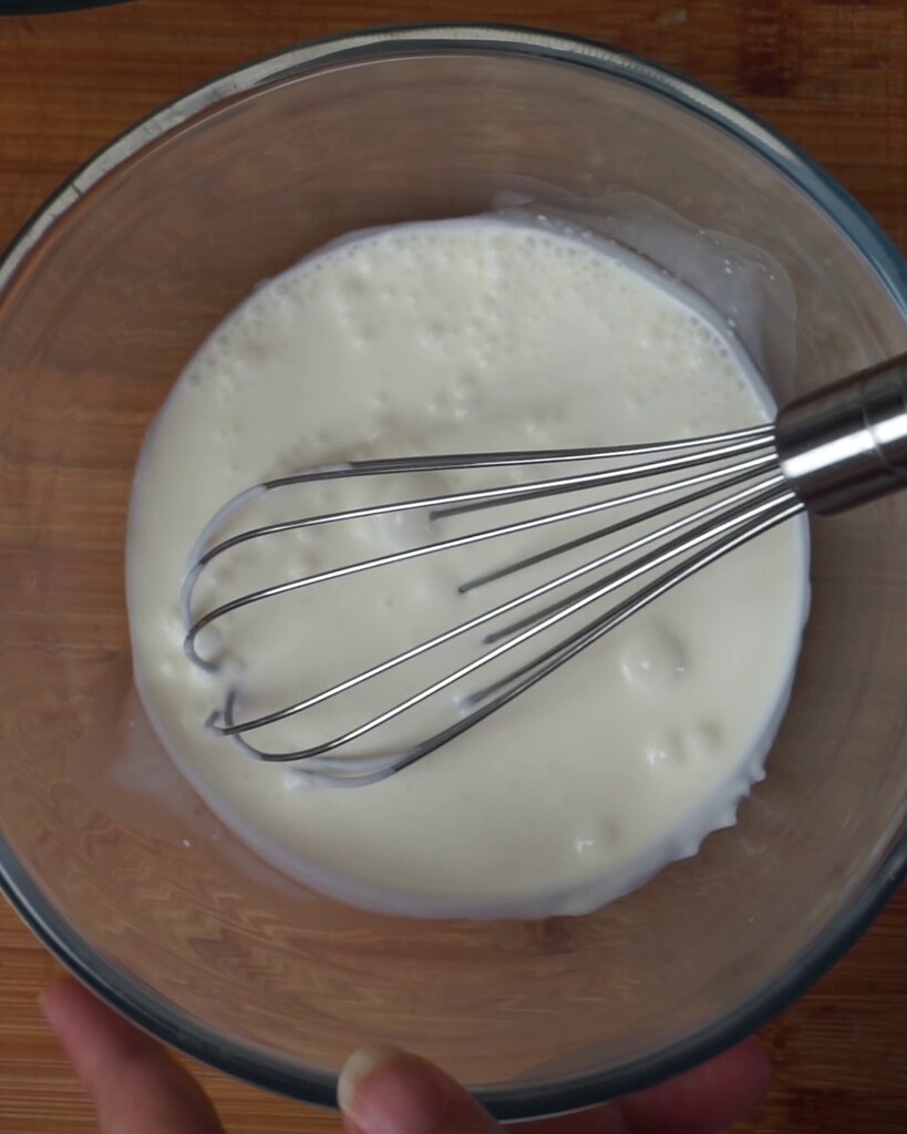 Préparez le babeurre : ajoutez au lait entier une cuillère à café de vinaigre de cidre ou blanc et mélangez avec un fouet. Vous verrez qu’en très peu de temps, il s’épaissira légèrement.