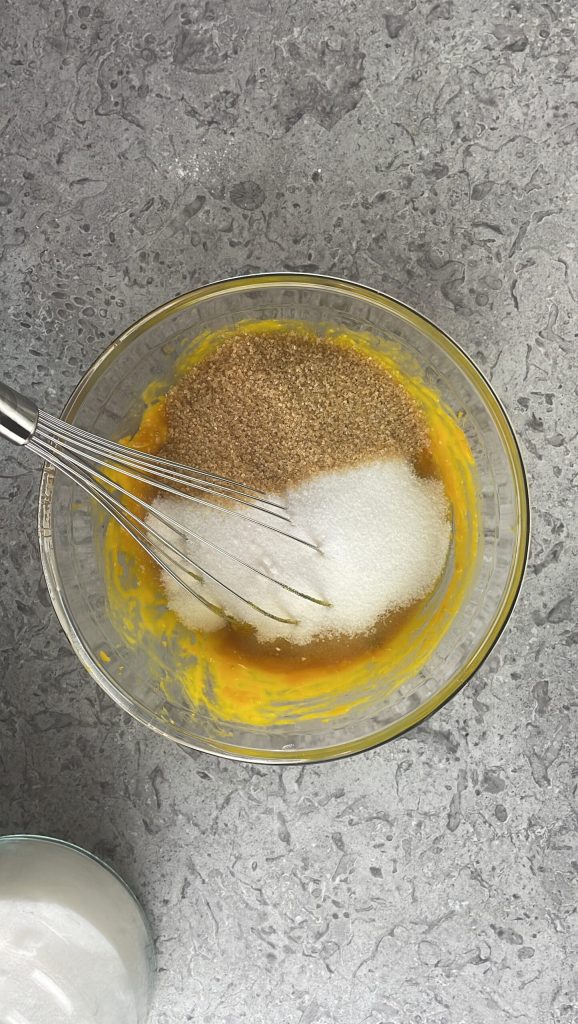 Ajoutez également le sucre de canne et le sucre blanc et mélangez à nouveau.