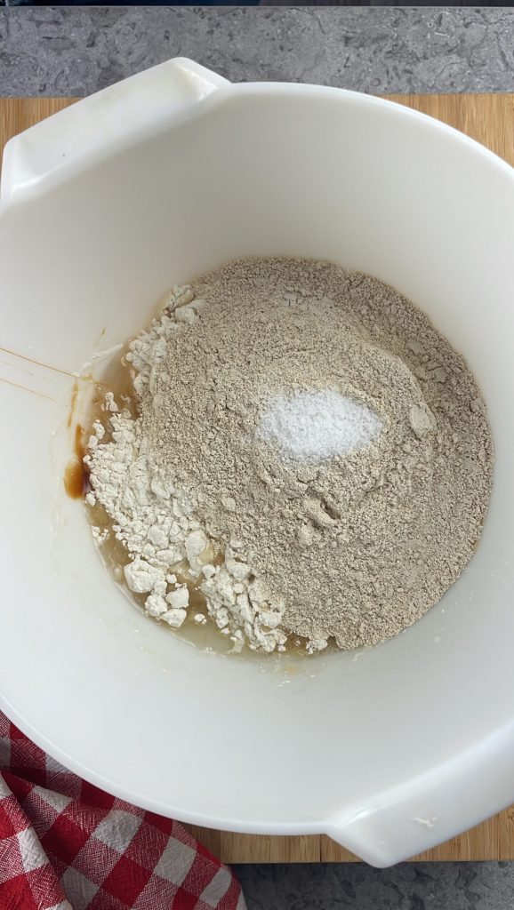 Ajoutez également l’huile de tournesol et le malt d’orge.Continuez en ajoutant dans le bol la farine 0, la farine de châtaigne et le sel.