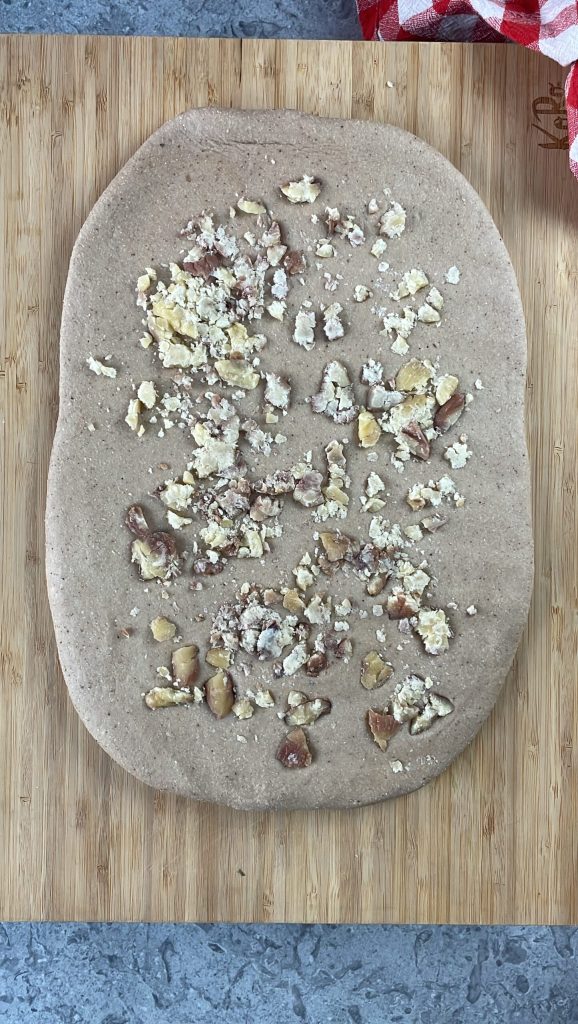 Ajoutez à la pâte les châtaignes bouillies préalablement émiettées grossièrement avec vos mains.Roulez la pâte le long du côté court et scellez bien les bords en pinçant la pâte avec vos mains.
