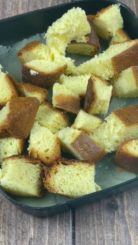 Coupez le pandoro en gros morceaux et mettez-le dans la plaque avec le beurre et le sucre.