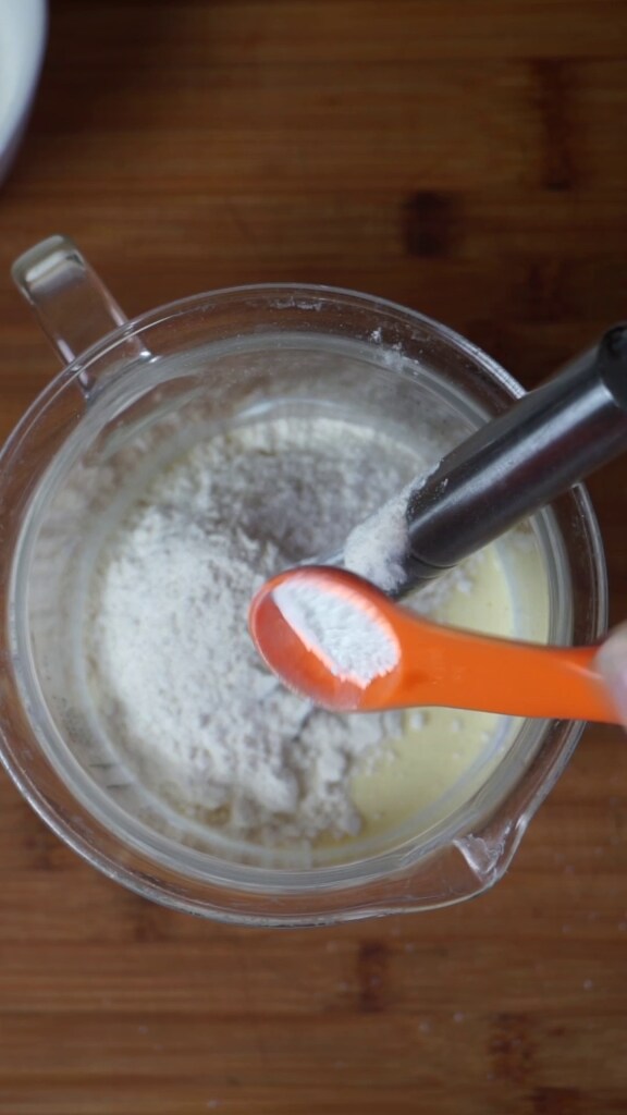 Continue avec la farine 00 et la levure chimique pour gâteaux : mélange à nouveau jusqu’à obtenir un mélange lisse, sans grumeaux et pas trop liquide.
