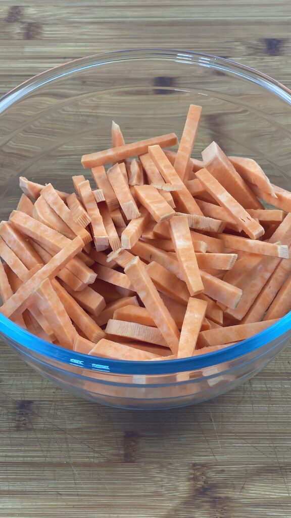 Commencez la préparation des patates douces épicées à la friteuse à air en épluchant la patate douce et en la coupant en bâtonnets. La mienne était assez grande avec un poids d’environ 500g et je n’en ai utilisé qu’une seule.