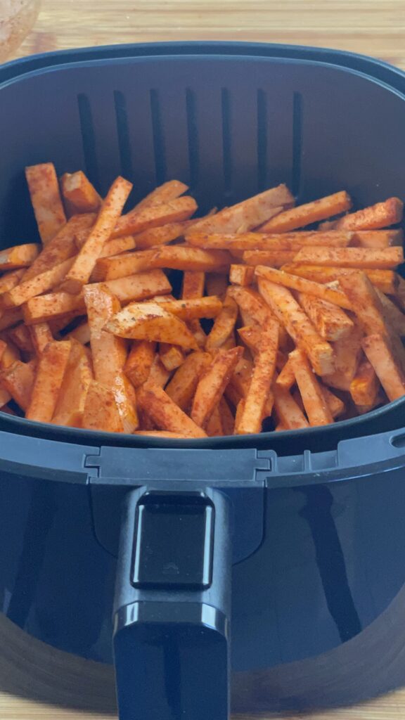 Cuisez les patates douces épicées à la friteuse à air à 200°C pendant 15-18 minutes en les mélangeant bien à mi-cuisson.
