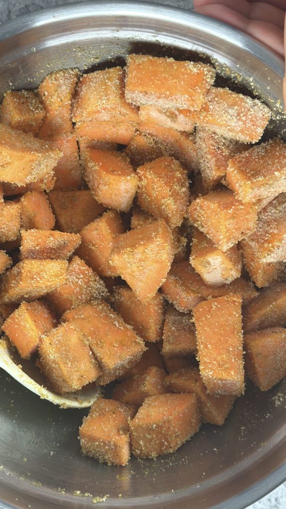 Ajoutez aussi l’huile et mélangez jusqu’à ce que tous les morceaux de patate douce soient parfaitement assaisonnés.