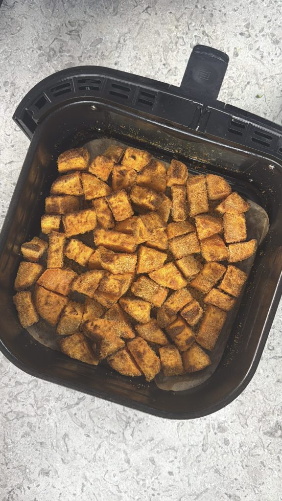 Le secret réside dans la panure légère à base de chapelure, enrichie de curry et de gingembre en poudre, qui apporte une note délicatement épicée sans couvrir la douceur naturelle des patates américaines. L’huile d’olive extra vierge lie les arômes et favorise un doré uniforme, tandis que la friteuse à air permet d’obtenir un résultat parfait en moins de temps.