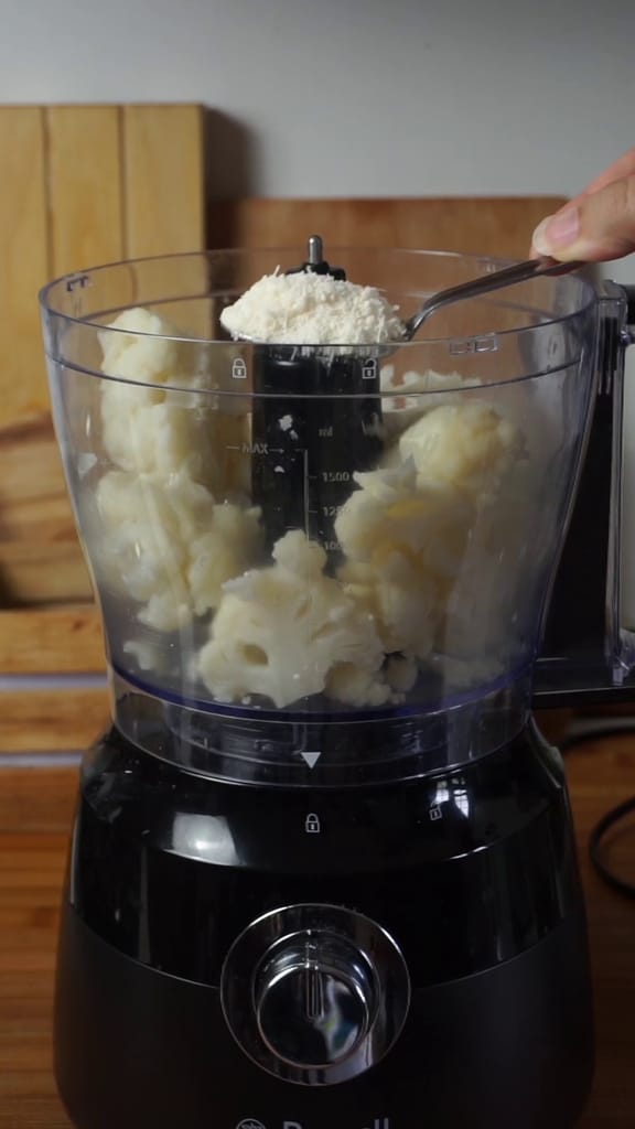 Transférez le chou-fleur cuit dans un robot de cuisine et ajoutez le parmesan râpé.